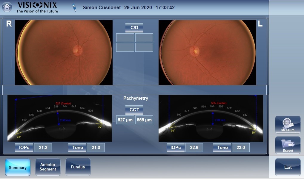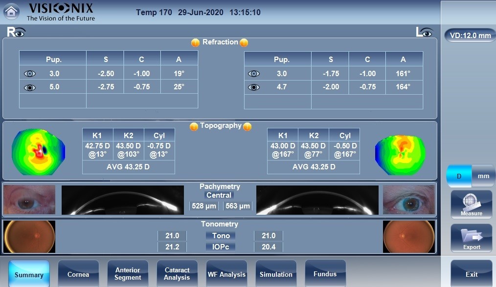 O Visionix® VX650 é o único instrumento de diagnóstico oftálmico que permite que todos os profissionais de saúde ocular realizem um exame oftalmológico completo com o toque de um botão ou um simples clic. Ele deteta todas as patologias visuais em menos de 90 segundos por olho.