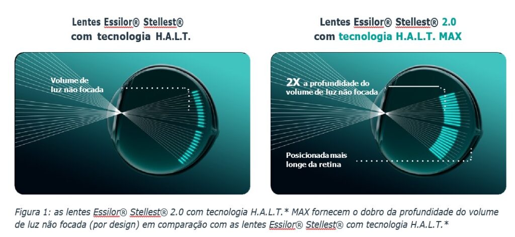 A Essilor® apresentou recentemente as lentes Essilor® Stellest® 2.0, equipadas com a avançada tecnologia H.A.L.T.* (Highly Aspherical Lenslet Target) MAX. Concebida com maior potência e asfericidade, esta lente de última geração baseia-se na tecnologia H.A.L.T.* original, lançada pela primeira vez na China em 2020. Validadas num estudo clínico cruzado de um ano, as lentes Essilor® Stellest® 2.0 demonstraram uma eficácia significativamente superior na desaceleração do crescimento do olho míope em comparação com as lentes de primeira geração.†1